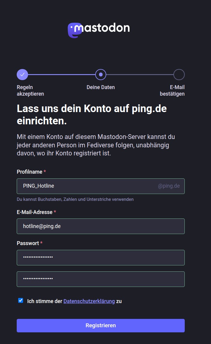 Um einen Account zu machen nutzt bitte den Einladungslink aus unserer Mail, oder Ihr fordert den Einladungslink bei hotline@ping.de oder admin@ping.de erneut an.