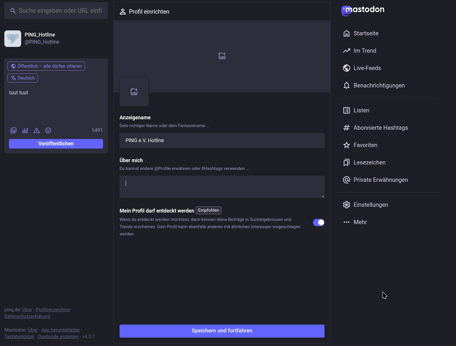 - Profil einrichten mit Anzeigename und Euren ersten trööt mit "Veröffentlichen" einstellen und "Speichern und fortfahren".